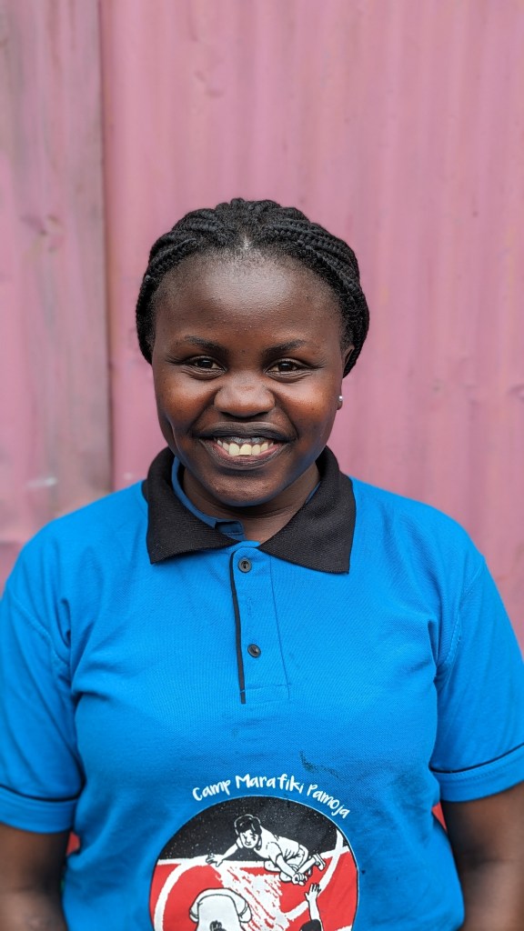 Teresia Mboga (Yvonne), Assistant Coordinator of Youth Volunteers. Teresia started volunteering with Camp Marafiki Pamoja in 2019 and took on the role of assistant coordinator in 2022. Teresia loves literally everything about camp! She says, “I get to teach the kids and I also get to learn and we have fun together in everything we do, it’s a way for me to serve humanity and serve my community and it gives me soo much satisfaction and contentment seeing the kids go back home everyday happy and smiling and always looking forward to Camp.”